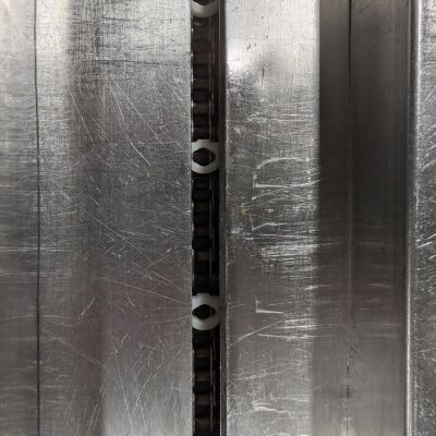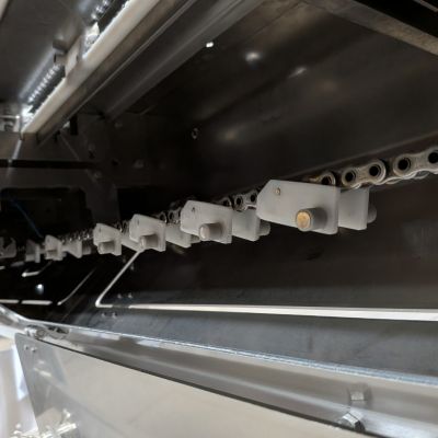 - Infeed System: Approximately 204″ long lugged infeed