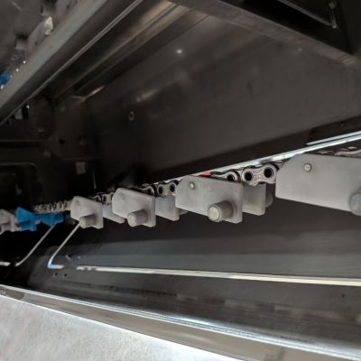 Designed for demanding production environments, this Pack 201 operates at OEM-rated speeds up to 150 packages per minute with consistent seal quality and package formation. The machine features an extended 204″ long lugged infeed system, configured for right-to-left product flow to optimize your production line layout. This well-maintained unit demonstrates the exceptional build quality and longevity that Syntegon equipment is known for throughout the packaging industry.